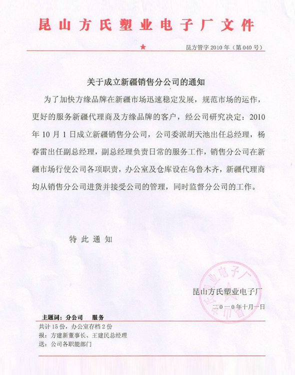 关于成立新疆销售分公司的通知