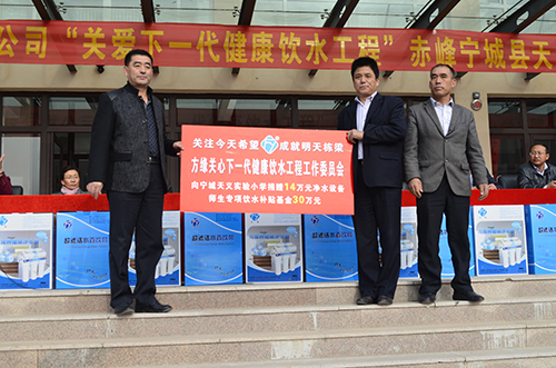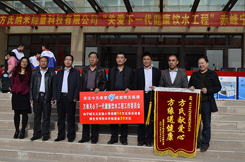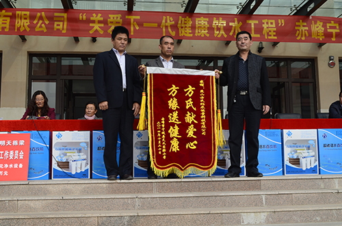继2013年9月方氏企业向内蒙古宁城县第三实验小学捐赠总价值52万元的净水设备,师生家长饮用水专项补贴基金后,方氏企业于2014年10月再次向宁城县天义小学捐赠价值44万元的净水设备和师生家长饮用水专项补贴基金。县教育局副局长孙辉,卫生局局长王朋飞,慈善总会会长赵小梅,方氏企业副总经理苗建伟,方缘宁城服务中心经理李荣军,天义小学全体师生及家长代表近三千人参加了21号的捐赠仪式。