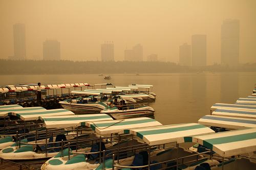 6月10日,游客在阴霾笼罩下的南京玄武湖上乘船游玩。南京地区当日出现能见度小于3000米的霾。自6月9日起,江苏省部分地区出现的夏季秸秆焚烧情况,加上静风、高湿、低压等不利扩散的气象条件,导致部分城市空气质量明显下降。据了解,5月下旬以来,江苏及周边地区进入秸秆焚烧高峰期。据卫星遥感影像解译和现场巡查结果,各地均存在不同程度的秸秆焚烧现象,其中,南京、扬州、镇江以及泰州等地较为严重。针对各地出现的空气质量下降情况,江苏省环保厅立即启动了应急防控预案,江苏省大气污染防治办公室、省环境监察局等部门紧急行动,全面防控。新华社发(董金林 摄)