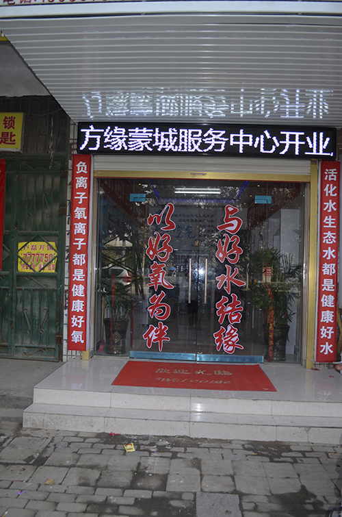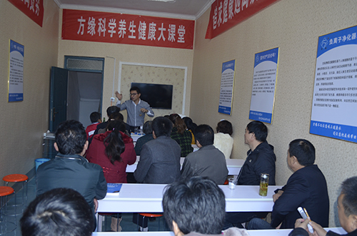 蒙城服务中心由一楼展示厅和二楼多功能方缘科学养生健康大课堂两部分组成。走进一楼展厅便被公司浓郁的文化氛围所吸引,“方缘社会公益事业产业化”系列展一下子让人们对方缘公司有了一种亲切感和认同感;右边别具一格的展柜和小巧精致的产品功能提示牌显示出主人的专业和用心;大门玻璃上的“与好水结缘,以好氧为伴”集中彰显了服务中心的主题意识,特别是门两边“活化水生态水都是健康好水,负离子氧离子都是健康好氧”的竖幅吸引了众多宾客驻足揣摩:什么是活化水?什么是生态水?带着这些问题大家不约而同的来到了二楼方缘科学养生健康大课堂。在这里一场别开生面的“水与健康”的知识讲座正在进行,市场总监刘冬简要的产品示范,让大家茅塞顿开: 噢.....原来看似简单的水还有这么多的奥秘呀!水与健康还有如此重要的关系啊!