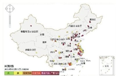 从中央气象台展现的全国雾区图可见,污染较重的地方和雾较重的地方吻合,集中在河北、京津、河南、陕西、安徽、浙江、湖北、四川等省市的部分地区。