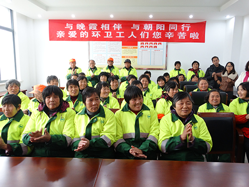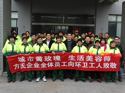 在2015年元旦即将来临之际,公司领导赵庆、苗建伟一行带着方氏企业全体员工的一片深情厚谊来到昆山陆家环卫处,慰问工作在这里的300余名环卫工人,为他们每人送来了一个高能量活化水杯和一桶花生油,以表达对这些“城市黄玫瑰、生活美容师”的感激之情和“与晚霞相伴、与朝阳同行”的环卫精神的崇敬之意。
