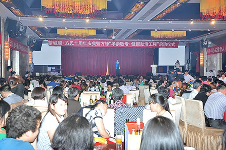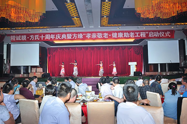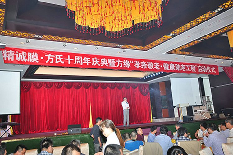 2013年5月18日,昆山美高美酒店宴会大厅里高朋满座、歌舞升屏,方氏企业十周年庆典暨方缘“孝亲敬老·健康助老工程”启动仪式在这里隆重举行。国家民政部原社会福利司司长白益华,全国卫生产业企业管理协会医药技术开发专业委员会会长刘儒,昆山民政局副局长兼社会慈善基金会秘书长严雪林,民政局福利慈善科科长钱瑛,陆家镇民政主任王建忠等领导以及方氏企业全国经销商、员工近五百人参加了本次活动。下午18时整,庆典暨启动仪式在欢快激昂的歌舞声中拉开了帷幕。