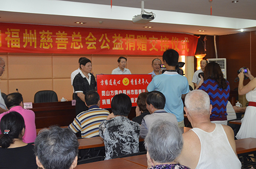 昆山方缘中老年事务综合服务中心向福州市慈善总会捐赠100台价值60万元高能量活化水机交接仪式,8月1日上午在福州市第一福利院隆重举行。方缘中老年事务综合服务中心主任苗建伟、方缘福州服务中心经理陈勋敏、福州市民政局党委书记兼局长张维船、民政局副局长兼市慈善总会副会长庄严、福州原市委副书记、市慈善总会会长方庆云、副会长张焰、洪锦煌、市民政局福利处处长程锦兰以及慈善总会各分会代表、受助单位代表近百人参加了交接仪式。福州电视台、福建电视台《八闽正能量》、福州日报、福州晚报、福州慈善公益报、《海西慈善》杂志社、海都报、东南快报等新闻媒体全程报道了活动盛况。