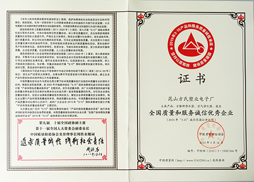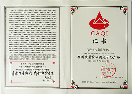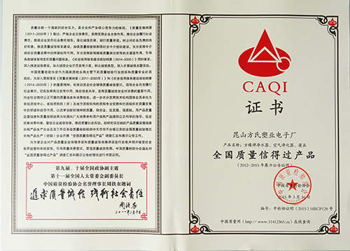 由昆山方氏企业生产的“方缘牌”净水器,“方缘牌”空气净化器,“方缘牌”3E仿生磁健康床垫系列产品荣获中国质量检验协会于2015年3月15日颁发的“全国质量信得过产品”、“全国质量检验稳定合格产品”、“全国质量和服务诚信优秀企业”。这是中国质量检验协会从2012年至2015年每年一度的市场调查汇总、展示公告、诚信承诺公告得出的结论。这也是方氏企业继2006年荣获质量、信誉双保障示范单位;二〇〇七年荣获中国活化水机产品十佳知名品牌;二〇〇八年荣获“国家质量监督检测合格——全国质量信得过产品”荣誉称号之后,摘取的又一全国性的质量大奖。