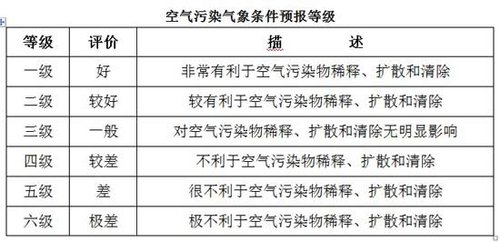 日常生活中,人们经常能听空气质量指数(AQI)这个词汇。空气质量指数(Air Quality Index,简称AQI)共分六级,从一级优,二级良,三级轻度污染,直至五级重度污染,六级严重污染。监测的污染物包括二氧化硫、二氧化氮、一氧化碳、臭氧、PM10和PM2.5共6个种类。空气污染气象条件预报等级标准和空气质量指数(AQI)等级标准相一致分为六级,明确预报了气象条件对于空气污染的影响,是利于污染物的扩散和清除,还是相反。具体预报等级如下图所示: