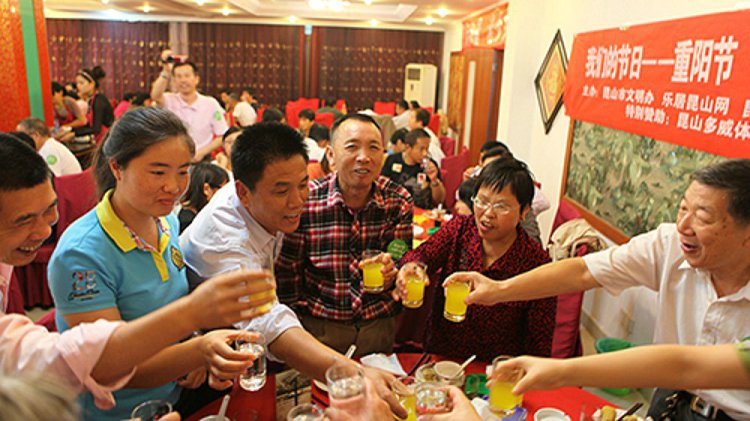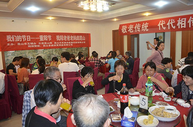 九时整,三辆大巴满载着这一百多号人浩浩荡荡的出发了。第一站便来到了昆山文化艺术中心,参观这座面积超过七万平方米的艺术场馆。“爸爸,上楼梯小心点儿。”“妈,您慢点走。”整个参观过程中,暖暖的关怀一直围绕着身边的长辈们。从艺术中心出来便驱车来到了美丽的阳澄湖公园,刚入园不一会儿,游客们便被一阵阵“加油,加油。”的喝彩声吸引的驻足观望,原来是57岁的朱小平阿姨在众人的喝彩声中玩起了儿时的滚铁环,一时间勾起了无数老人的童年回忆,大家也纷纷加入其中。朱小平阿姨说:“小时候经常玩这个,没想到今天在这里过重阳节还能重温一下童年,真是太开心啦。一会再买一个给孙女带回去,老少同乐。”就这么玩着、乐者,不知不觉就到了午餐时间。在“蟹旺舫”的餐厅中,十几桌丰盛的酒席已准备就绪“代际和谐 · 老少共荣”“敬老传统 · 代代相传”的横幅映入眼帘,一种家的温暖,一种油然而生的感动让人心里甜丝丝的。开席前,苗总、袁总代表公司董事会和主办方的领导祝各位老人节日快乐、家庭幸福。大家共同举杯表示感谢。有游客用八个字形容这次旅行“玩到、乐到、吃到(不负盛名的阳澄湖大闸蟹)、拿到(每人一双保健运动鞋)。今天的活动提示我们:其实孝顺很简单,就是每天打一个电话给爸妈,有时间常回家看看爸妈,有条件的陪老爸老妈出来走走逛逛。