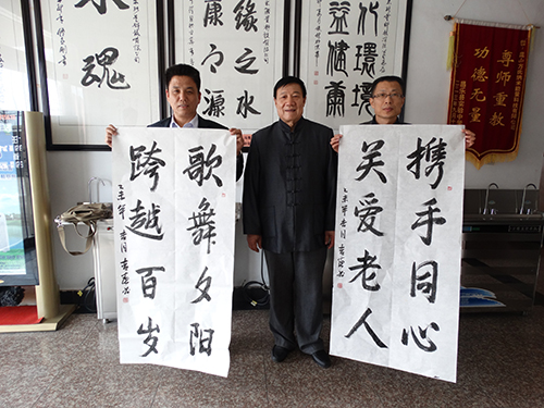访问期间冯先生为方缘中老年事务综合服务中心欣然命笔、挥毫题字:携手同心、关爱老人、歌舞夕阳、跨越百岁。随后,冯先生与方董就中老年文化生活、书法艺术、公益活动等话题进行了广泛交流。