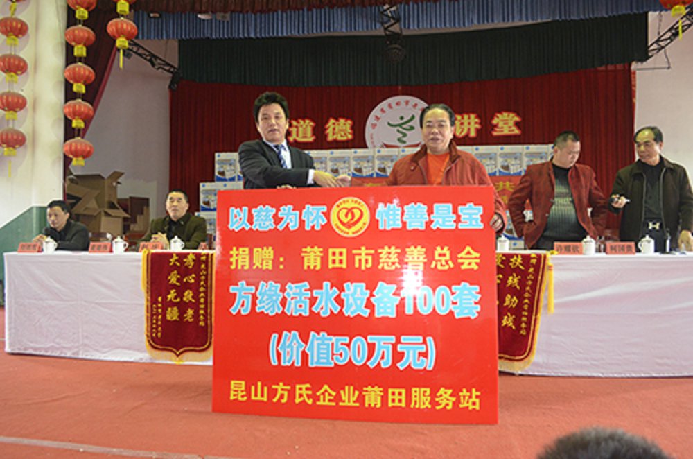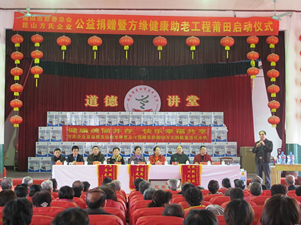 启动仪式上,方氏企业向莆田市慈善总会捐赠了总价值50余万元的高能量活化水机,用于改善老年大学、残疾人联合会、社区老年活动中心等单位老年人的饮水条件。市慈善总会、老年大学等受捐单位向方氏企业回赠了证书和锦旗以示感谢。