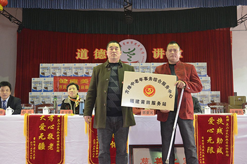 方缘全国孝亲敬老•健康助老工程暨公益捐赠仪式于12月26号在福建省莆田市老年大学礼堂隆重举行。方氏企业常务副总赵庆、副总经理苗建伟、方氏企业莆田服务中心经理许耀心、莆田市慈善总会会长郭亚元、市老干部局副局长兼老年大学常务副校长黄玉英等领导及老年大学学员近200多人参加了活动。