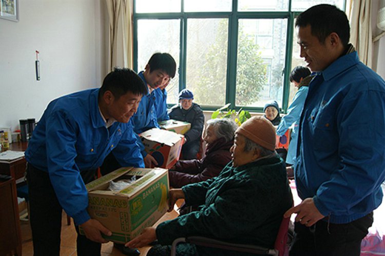 团拜会结束后,公司领导和民政局领导与福利院的长辈们合影留念。工作人员把香蕉橘子等水果送到了老人病房。