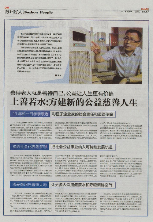 2014年6月25日《江南时报》整篇幅报道我企业董事长方建新的公益慈善人生。