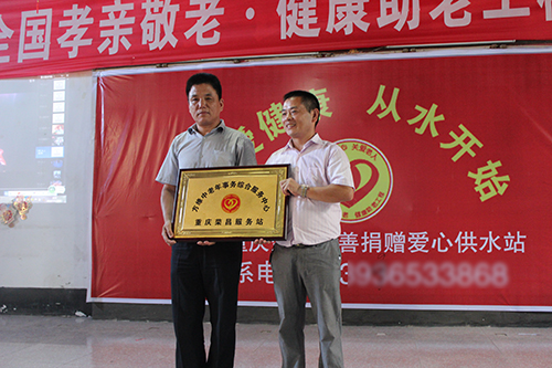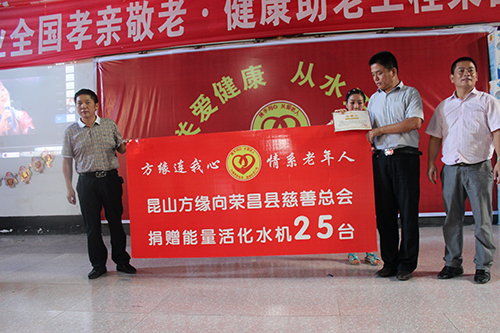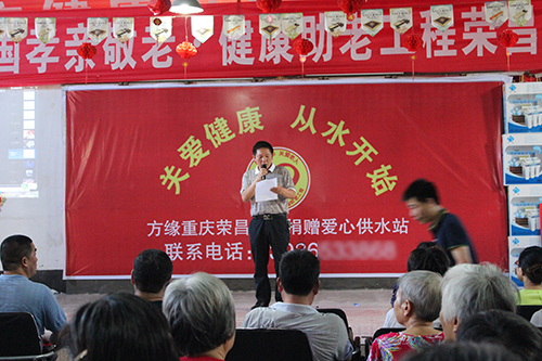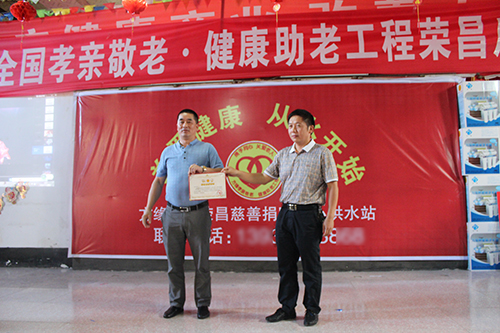 这天一大早,二百多位中老年朋友及各方嘉宾早早的来到活动现场见证这感人的一刻—苗总代表方氏企业向荣昌慈善会捐赠了二十五套净水设备,并向方缘荣昌服务中心颁发了“方缘中老年事务综合服务中心荣昌服务站”的牌匾。赵总亲自将净水设备一一送到各敬老院院长的手中,荣昌民政局长、慈善会副会长兼秘书长雷洪伟在致辞中对方氏企业的公益善举表示了衷心的感谢和崇高的敬意,并表达了双方就社会养老、公益慈善等方面进行长期合作的意愿。简单而隆重的捐赠仪式在全场高唱的《没有共产党就没有新中国》的歌声中落下帷幕。