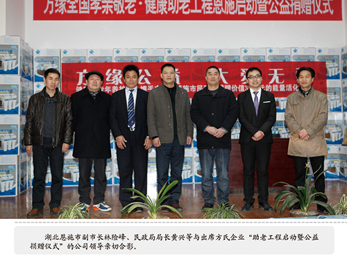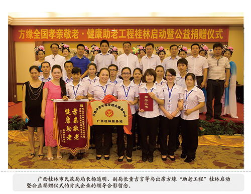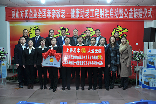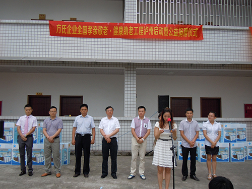 四川泸州市民政局局长兼慈善总会会长刘洪、市老龄委主任袁红玉出席方缘“助老工程”泸州启动暨公益捐赠仪式的方氏企业领导合影留念