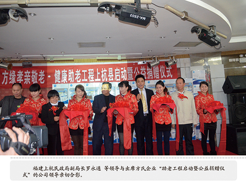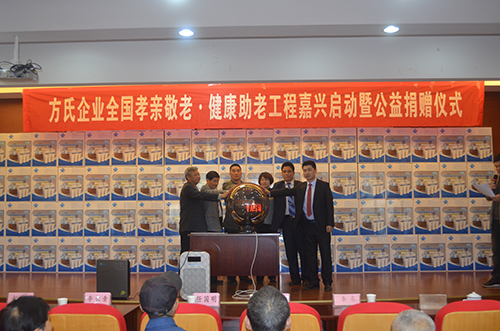 嘉兴市民政局副局长任国明、市老年服务业协会会长李长青等领导为方缘“助老工程”嘉兴启动暨公益捐赠仪式剪彩