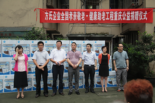 重庆市慈善总会秘书长李慧新、渝中区慈善总会会长蒋怀德等领导与出席方缘“助老工程”公益捐赠仪式的方氏企业领导亲切合影