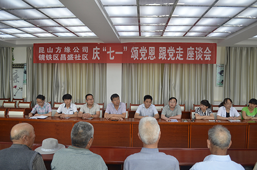 嘉峪关市昌盛社区党总支书记李吉忠、方氏企业副总苗建伟等领导与出席“庆七一、颂党恩、跟党走”座谈会的部分老党员合影留念