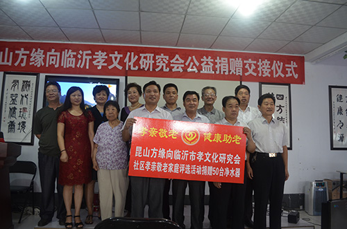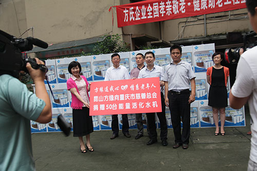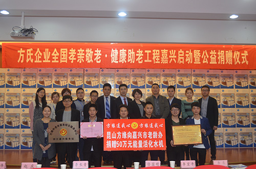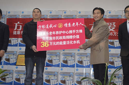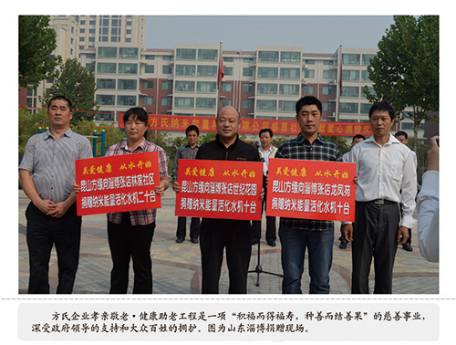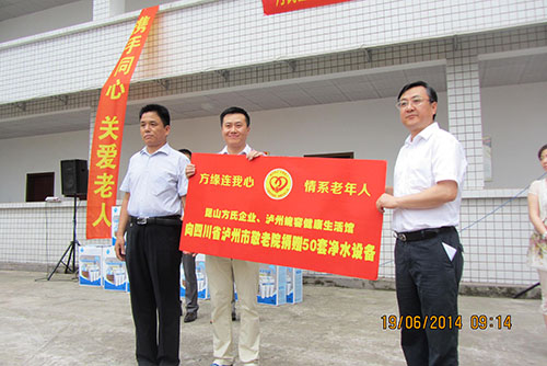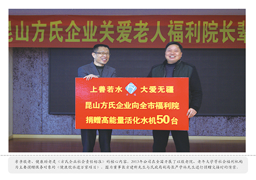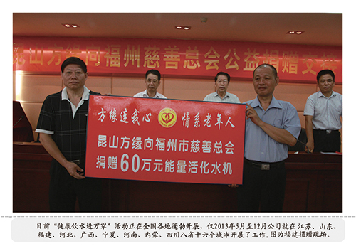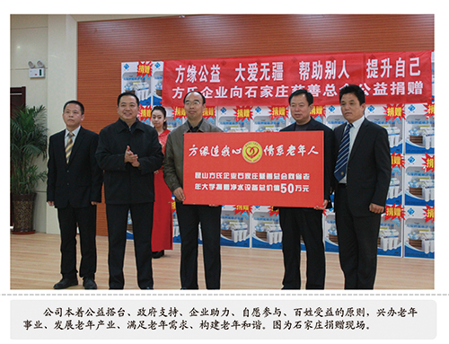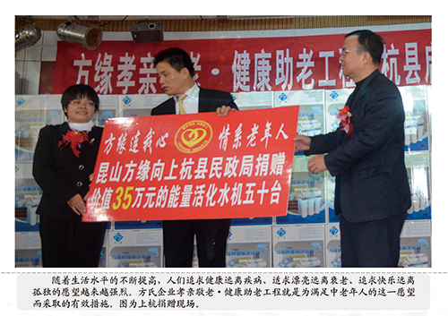 方缘全国孝亲敬老·健康助老工程是方氏企业为应对中国人口老龄化、健康老康化、推动中国养老事业实施产业化运作、规范化管理、标准化服务采取的一项战略措施。为保证工程的顺利实施,公司出台了《方氏企业社会责任标准》,经昆山市民政局批准成立了“方缘中老年事务综合服务中心》”,在全国开展了“方缘中老年健康饮水进万家项目”;“方缘中老年健康文化艺术团项目”;“方缘中老年科学养生健康大课堂项目”;“方缘中老年人千人就业、万人健康项目”等一系列以中老年为主体,以孝亲敬老为主题的专为老年人服务的社会公益活动,特别是“方缘中老年健康饮水进万家项目”,让众多的生活在养老院里的老人们喝上了安全健康的“方缘水”。一年来,方氏企业向江苏、山东、河北、河南、福建、浙江、四川、重庆、山西、宁夏、甘肃、内蒙、广西13个省27个地、市、县的四百余家敬老院、福利院捐赠2000余套净水设备。