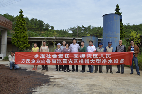 根据市抗震救灾指挥部的统一安排,方氏企业捐赠的大型净水设备被指定用在医疗、教育系统及这些部门的灾后重建方面。接到任务后,救援小组不顾余震和泥石流的危险,深入灾区一线,实地考察,寻找水源安置点,在昭通市政府的办公室,市慈善总会等部门的大力支持和协助下,圆满的完成了救灾任务。