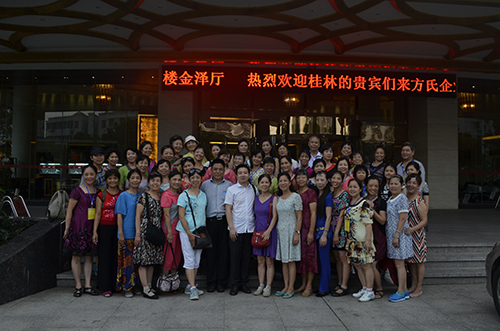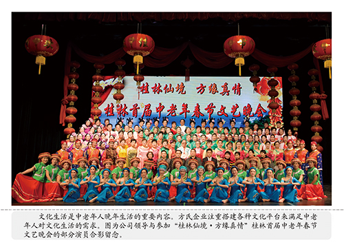 文化生活是一个人的灵魂,也是中老年人晚年生活的重要内容。随着生活水平的提高,广大中老年朋友追求健康,远离疾病;追求漂亮,远离衰老;追求快乐,远离孤独;追求财富,远离贫穷的愿望越来越强烈。方缘“孝亲敬老·健康助老”工程就是为满足广大中老年朋友这一美好愿望而采取的一项有效措施。方氏企业注重搭建各种文化平台来满足老年人对文化生活的需求,我们在全国许多城市开展了“方缘中老年健康文化艺术节”、“方缘中老年春节文艺晚会”等深受中老年人喜爱的活动,通过这些活动展示了中老年人热爱生活、追求健康、积极向上的精神风貌,营造了“嘹亮的歌声、快乐的笑声、热情的掌声” 等老年和谐晚年生活的氛围,对“老有所养、老有所依、老有所学、老有所为、老有所乐”的老龄工作目标进行了有效的实践和尝试,积累了丰富的经验,为实现“健康与美丽并存、快乐与幸福共享;歌舞夕阳、跨越百岁”的愿望奠定了有效的基础。 方氏企业在昆山五星级的美高美大酒店设宴款待参加桂林仙境·方缘真情中老年春节文艺晚会的部分获奖演员。图为公司领导与第二批来昆山旅游的部分获奖演员合影