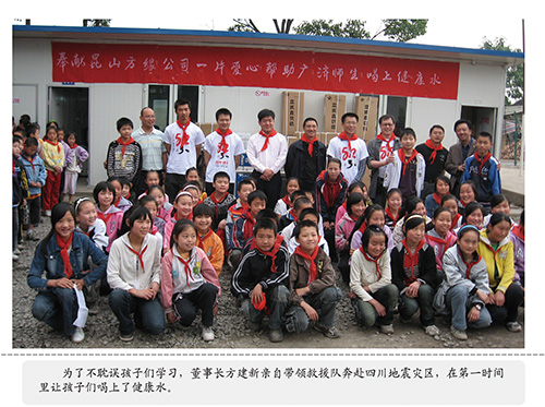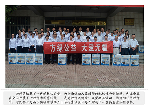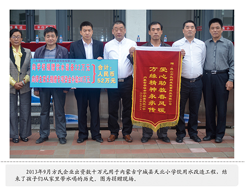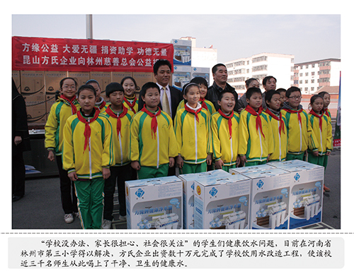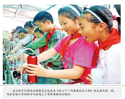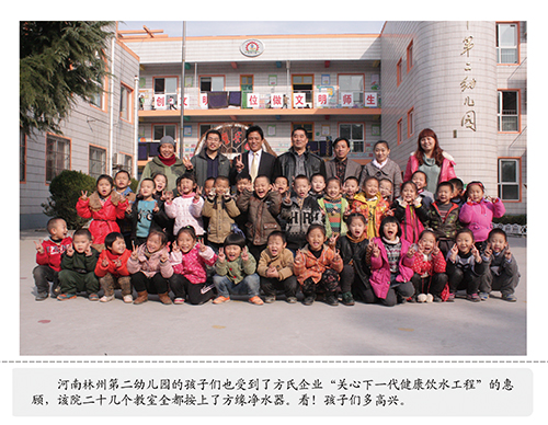 孩子不仅是祖国的未来,也是《方氏企业社会责任标准》的重要内容和工作方向。针对当前“学校没办法,家长很担心,社会很无奈”的在学校生饮水难的现状,方氏企业社会公益事业办公室专门启动了针对孩子们的“关心下一代健康饮水工程”、“阳光下的关爱、人世间的真情”方缘残疾人专项救助工程,设计生产了专供学校、幼儿园使用的饮水平台。目前,方氏企业已向江苏、山东、广西、内蒙、河南、湖北、云南、四川的近二十所学校、幼儿园免费捐赠大型饮水台近百套,约近五万名孩子喝上了健康水。
