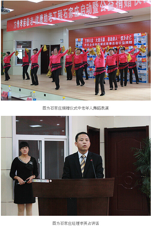 启动仪式上举行了“昆山方缘中老年人服务中心”石家庄服务站授牌仪式和昆山方氏企业向石家庄慈善总会公益捐赠交接仪式,苗总向与会人员简单介绍了方缘“助老工程及社会公益活动在全国的开展情况。许风扬副局长对方氏企业的公益善举给予了极高的评价,中老年文艺团体表演了精彩的文艺节目。