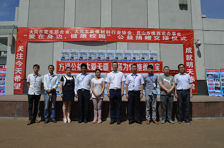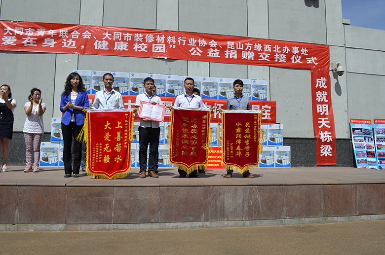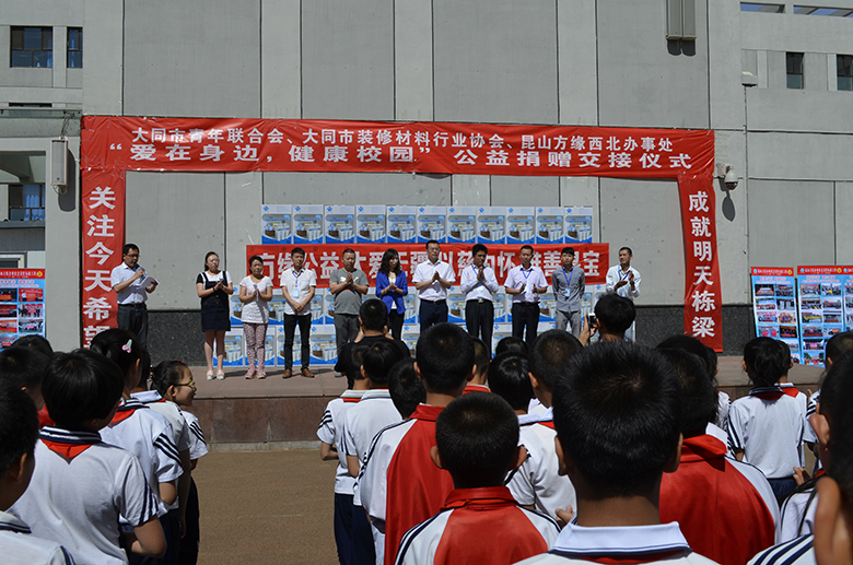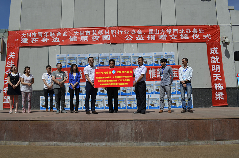在热烈庆祝六一国际儿童节的喜庆日子里,方氏企业、方缘西北办事处联合共青团大同市委、大同市青年联合会、大同市装饰材料协会共同启动了:爱在身边、健康校园——方缘关心下一代健康饮水工程,并首批捐赠了50套净水设备,用于改善大同市部分学校孩子们的饮水条件。共青团大同市委付书记、市青联主席杨亚丁、大同市少工委主任王磊、大同市青年联合会秘书长李晋、大同市装饰协会会长王利利、昆山方氏企业董事李记民、副总经理苗建伟等参加了启动暨公益捐赠交接仪式。