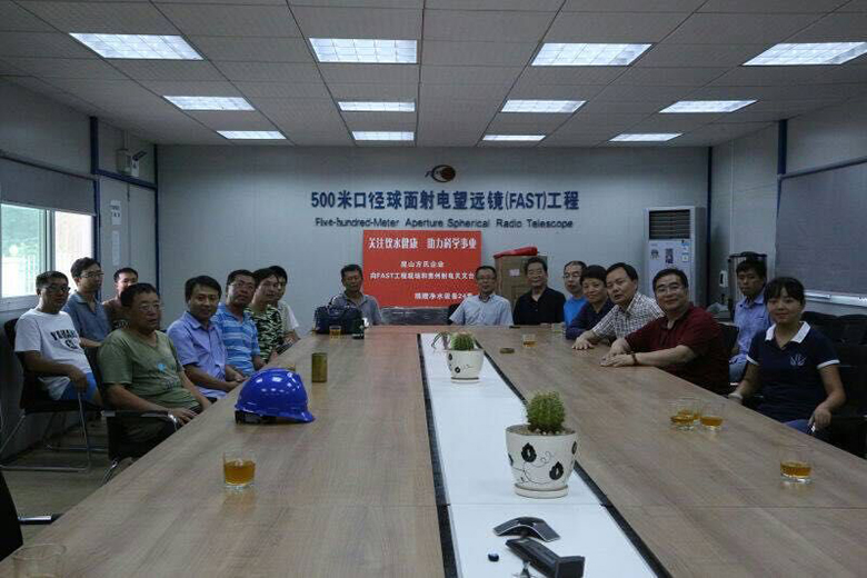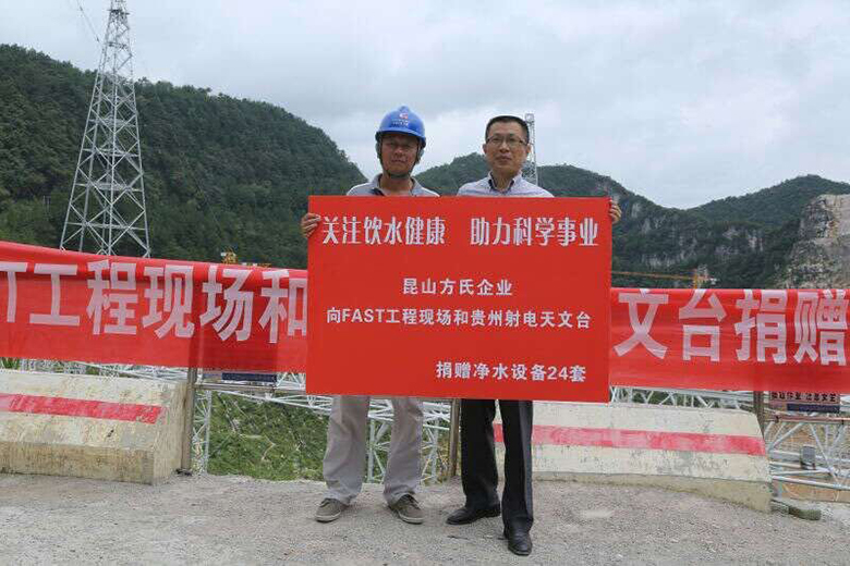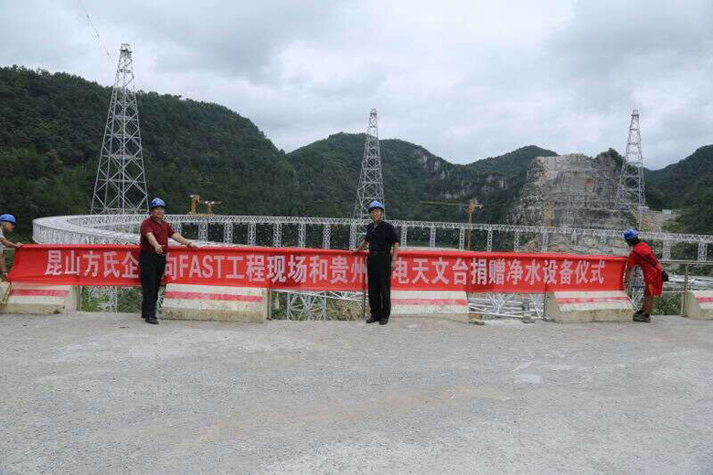 贵州射电天文台是我国九大科技基础设施项目之一,建成后将拥有世界上最大口径的射电望远镜。该工程2011年开工,现场工作人员超过200人,因为当地水质较差,工程队的日常生活,饮用水都需要从一小时车程外的县城进行采购,十分不便。我公司董事长方建新得知这一情况后,立即与该项目总指挥,清华大学教授王启明取得联系,并从公司调了一批净水设备捐赠到工程现场。通过近3天的安装和调试,目前,这些设备已经可以正常使用:10套生活用水净水设备平均每小时可处理5吨深井水,14套饮用水净水设备平均每分钟可处理1.5公斤深井水,基本满足了工程队施工期以及后续办公用水的需求。之后,当地经销商还将定期为这些设备进行维护。