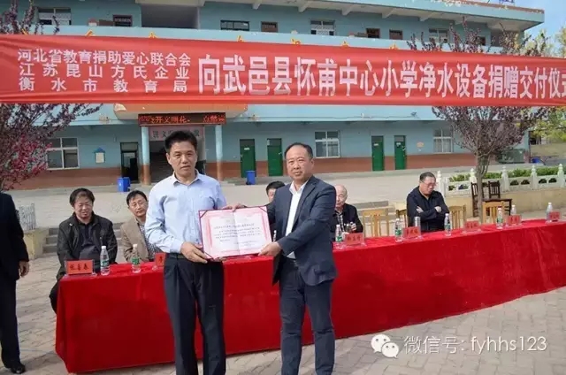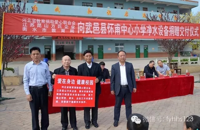 自2016年5月,方氏企业联合河北省教育厅爱心捐助联合会启动“爱在身边 ,健康校园——方缘关心下一代健康饮水工程”以来,积极贯彻落实教育部和国家卫计委《关于加强学校食源性疾病监测和饮用水卫生管理工作的通知》的指示精神,全力配合河北省委、省教育厅“基层年”活动,向石家庄、秦皇岛、承德、张家口、衡水、保定等13市县区的近20所小学、幼儿园捐赠净水设备近300套,使2万余名师生喝上了健康水,同时建立学校、家长、企业三方关爱系统,设立校园健康饮水专项补贴基金,以保证一些家庭条件较差的孩子回到家中也能喝上健康水。同时还启动“爱在身边,关爱园丁”、“美丽乡村,健康家园”等多项公益工程,使三百余位教师、村民以健康饮水专项补贴基金的方式使用上了方缘净水设备,喝上了卫生、健康的方缘水,初步实现了把健康饮水工程办成领导关怀的政府工程,全民参与的社会工程,讲道德比奉献的爱心工程,老百姓的希望工程的工作目标。