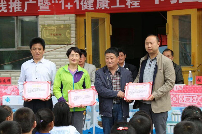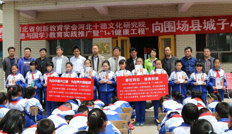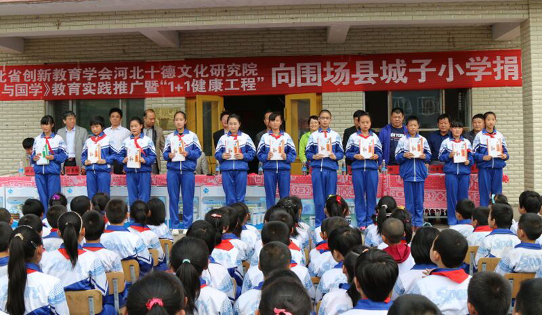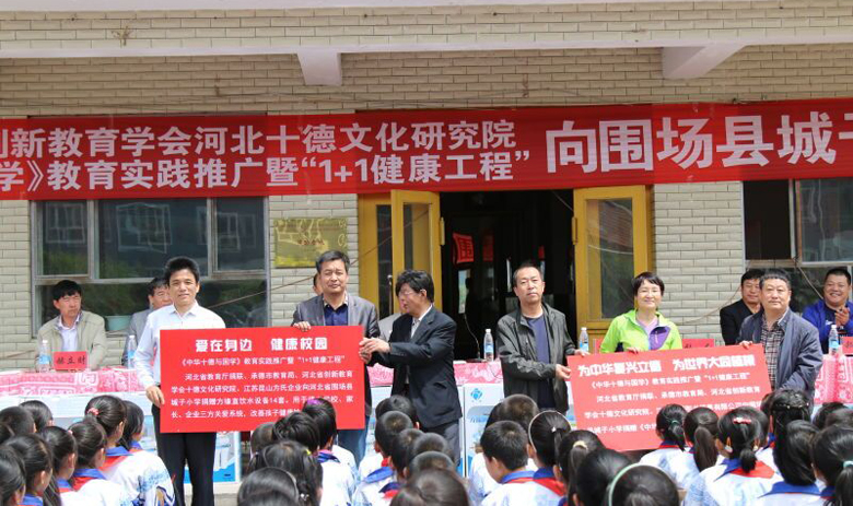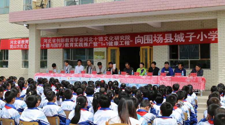 由方氏企业,河北教育厅捐联,河北创新教育学会十德文化研究院共同启动的“河北省中华十德与国学教育实践推广1+1健康工程”捐赠推广工作小组一行,在承德市教育局党组副书记、副局长樊广文、教育局主任严景龙的陪同下,来到承德市围场县城子乡城子小学进行1+1健康工程捐赠推广工作。围场县副县长王金良,县教育局副局长唐文优,城子乡乡长赵忠军等领导及全体师生四百余人参加了捐赠推广活动。