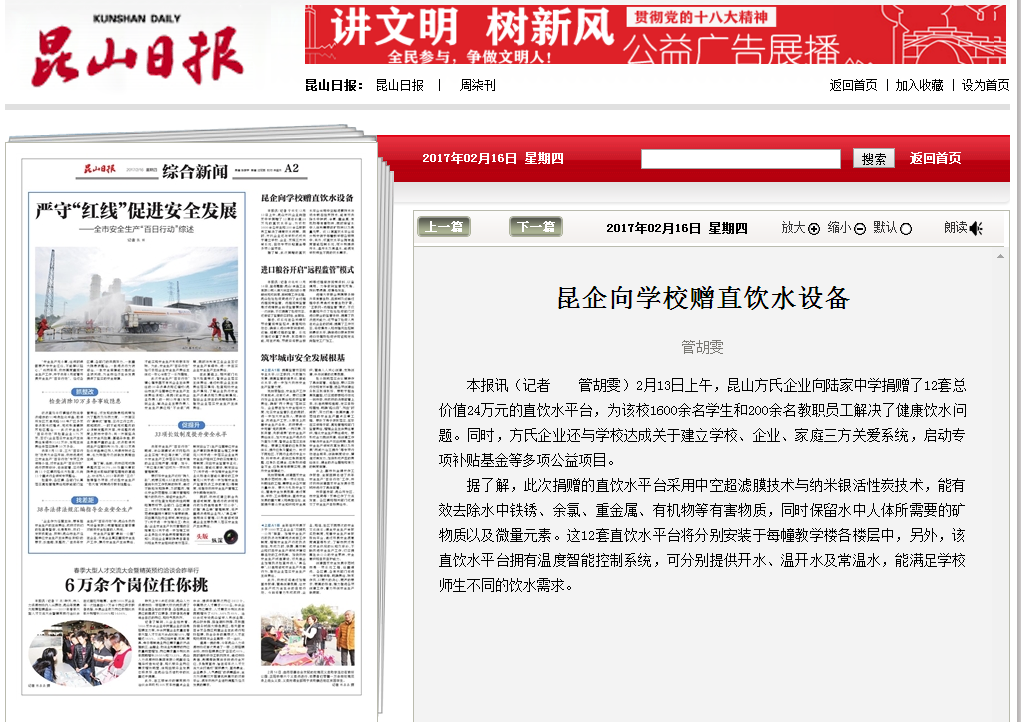 | 昆山日报报道我企业向学校捐赠直饮水设备 |