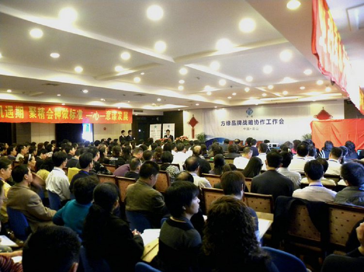 金秋十月“方缘品牌战略协作工作会”在昆山市天元酒店胜利召开,会议集中了来自北京、上海、山东、陕西、山西、辽宁、广西、四川、云南、贵州、江苏、浙江、河北、安徽、福建、江西16个省近百个地区的198名代表。会议开幕仪式上,董事长方建新先生致欢迎词,副董事长王建民先生致答谢词,生产厂长兼总工程师沈洪春先生对我企业的生产现状作了详细的阐述。会议历时三天,从战略、策略到方缘品牌新VI正式启动及“终端二十种营销法则”等几个方面进行了全面的解析。 大会最终签约率达到了超国际标准的117%。与会代表会后都群情激昂,因为了解清楚了战略目标,详细的学习到了终端营销方法,要信心百倍的投入到新的市场中。