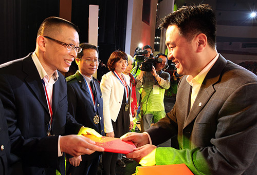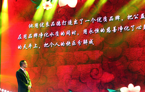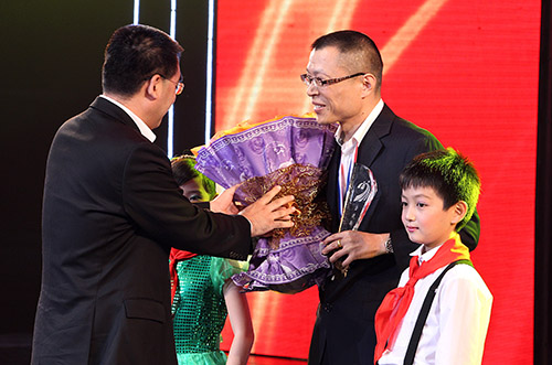 图为组委会给方总颁发”感动昆山“道德模范奖状和鲜花
